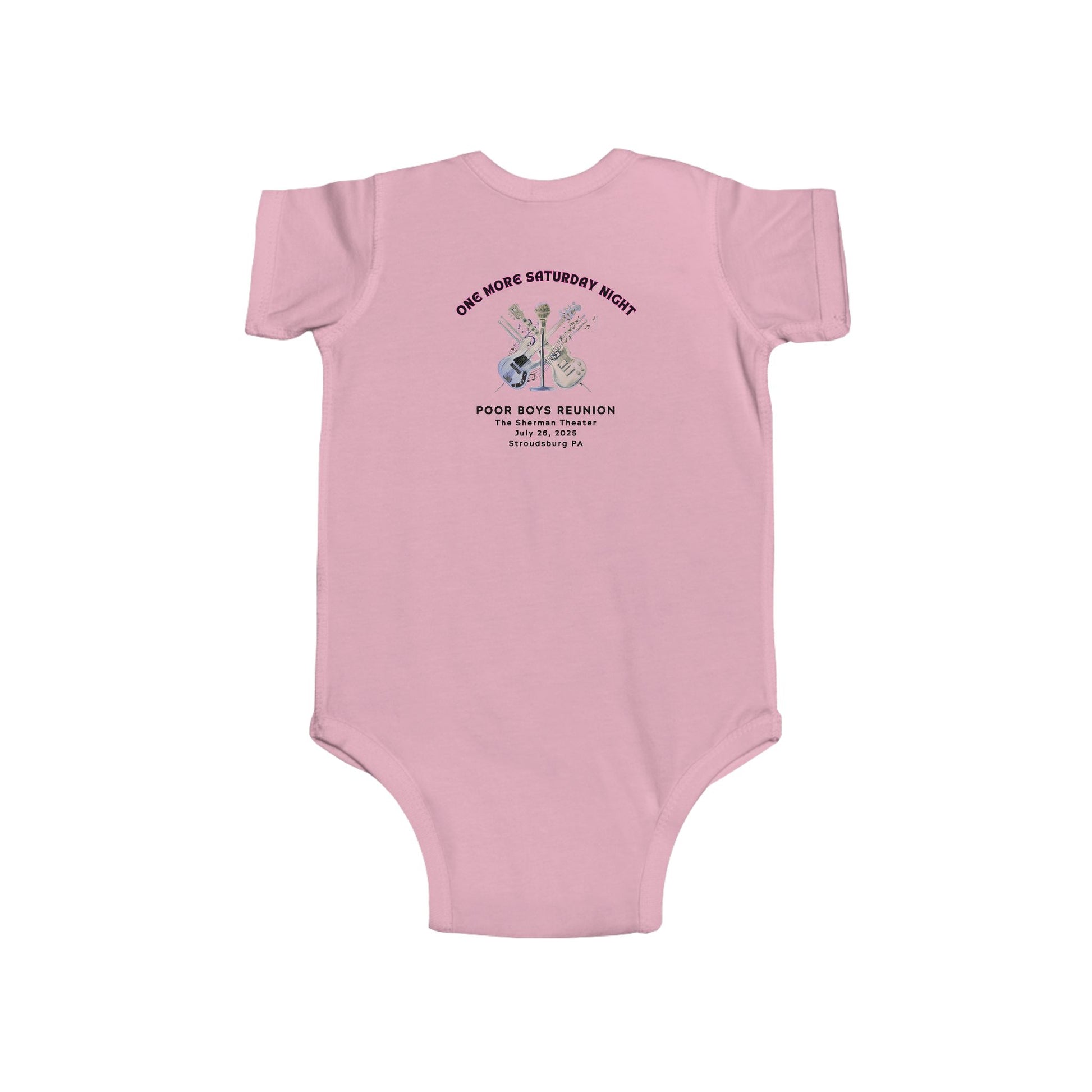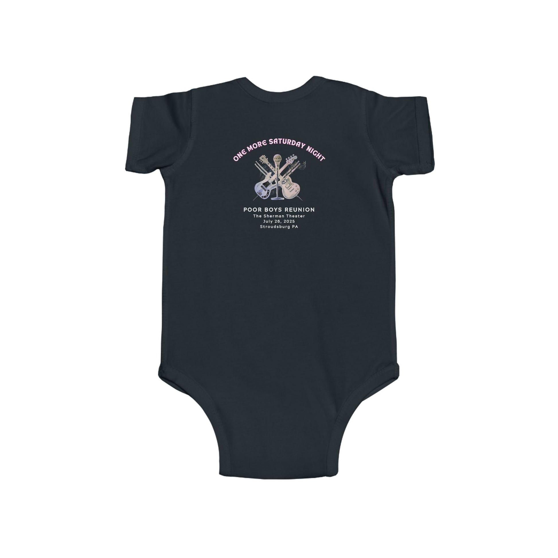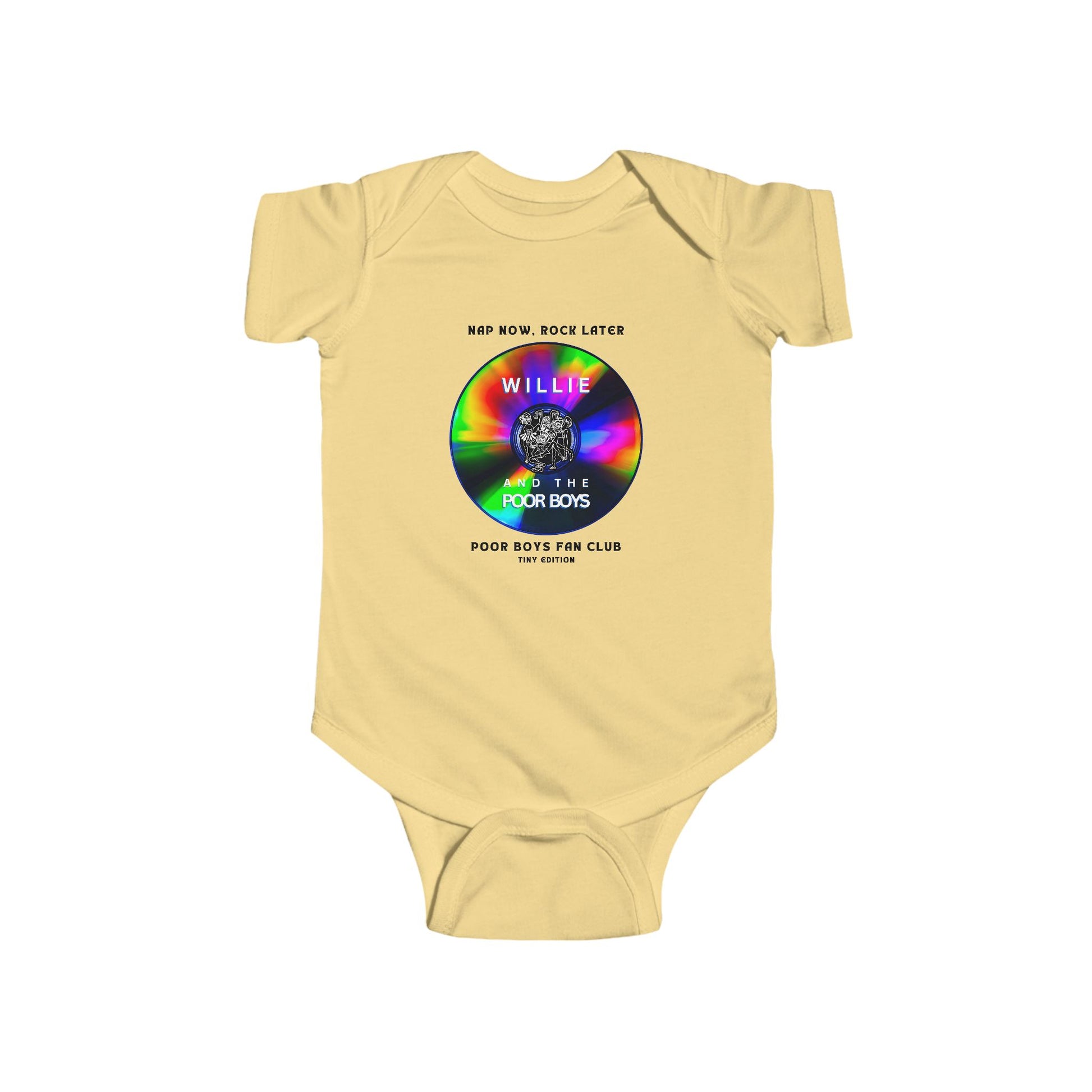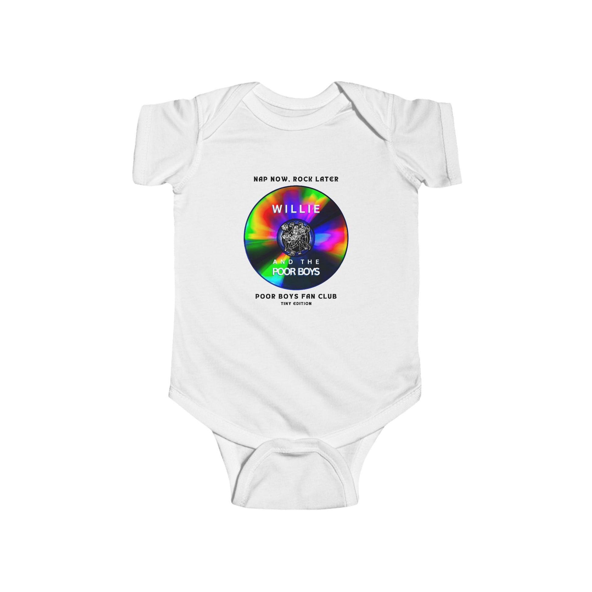 This cozy infant bodysuit features a playful front design with “Nap Now, Rock Later,” a vibrant CD graphic, and the classic Willie & The Poor Boys logo. On the back, it proudly welcomes your little one to the Poor Boys Fan Club – Tiny Edition, making it a perfect mix of comfort, color, and music legacy.