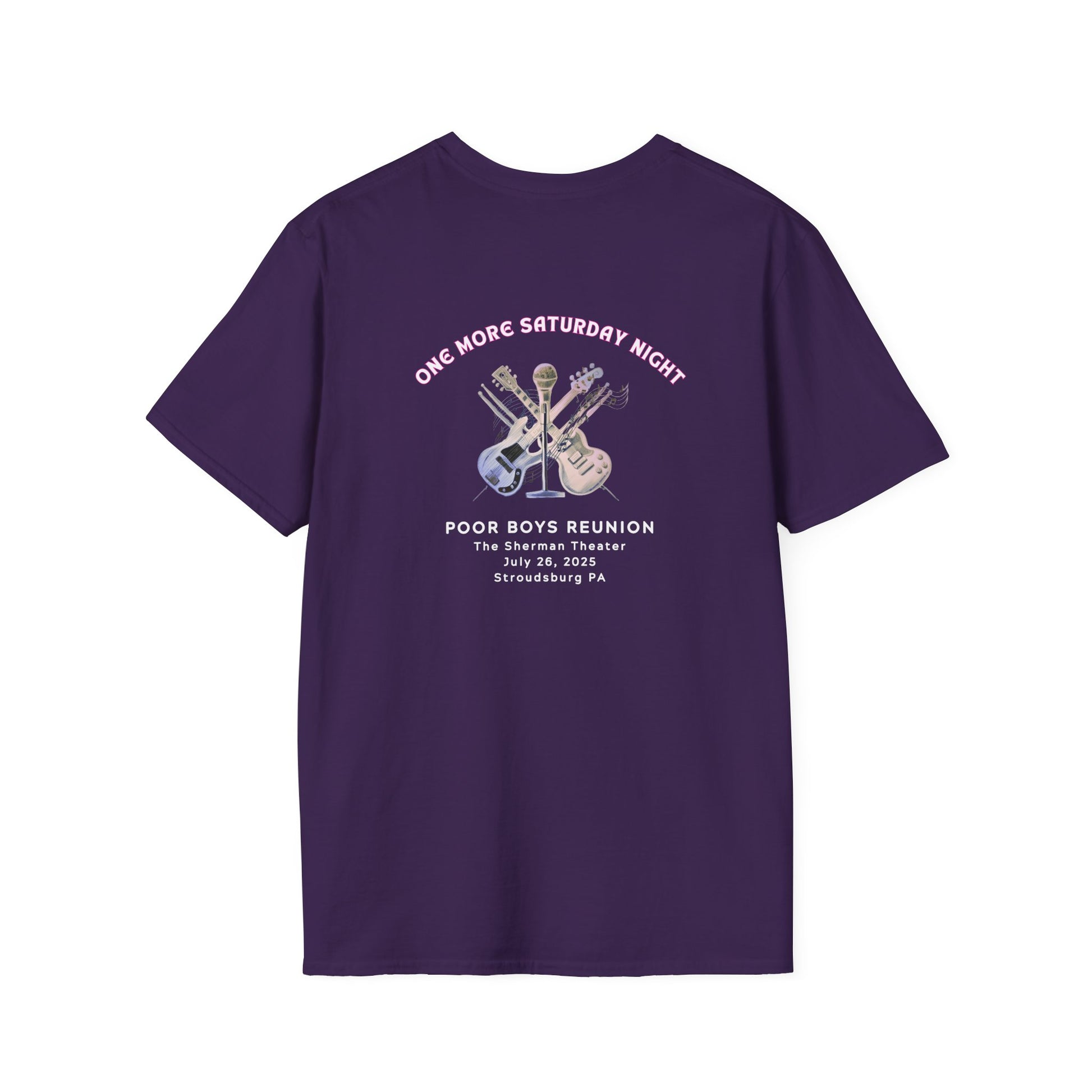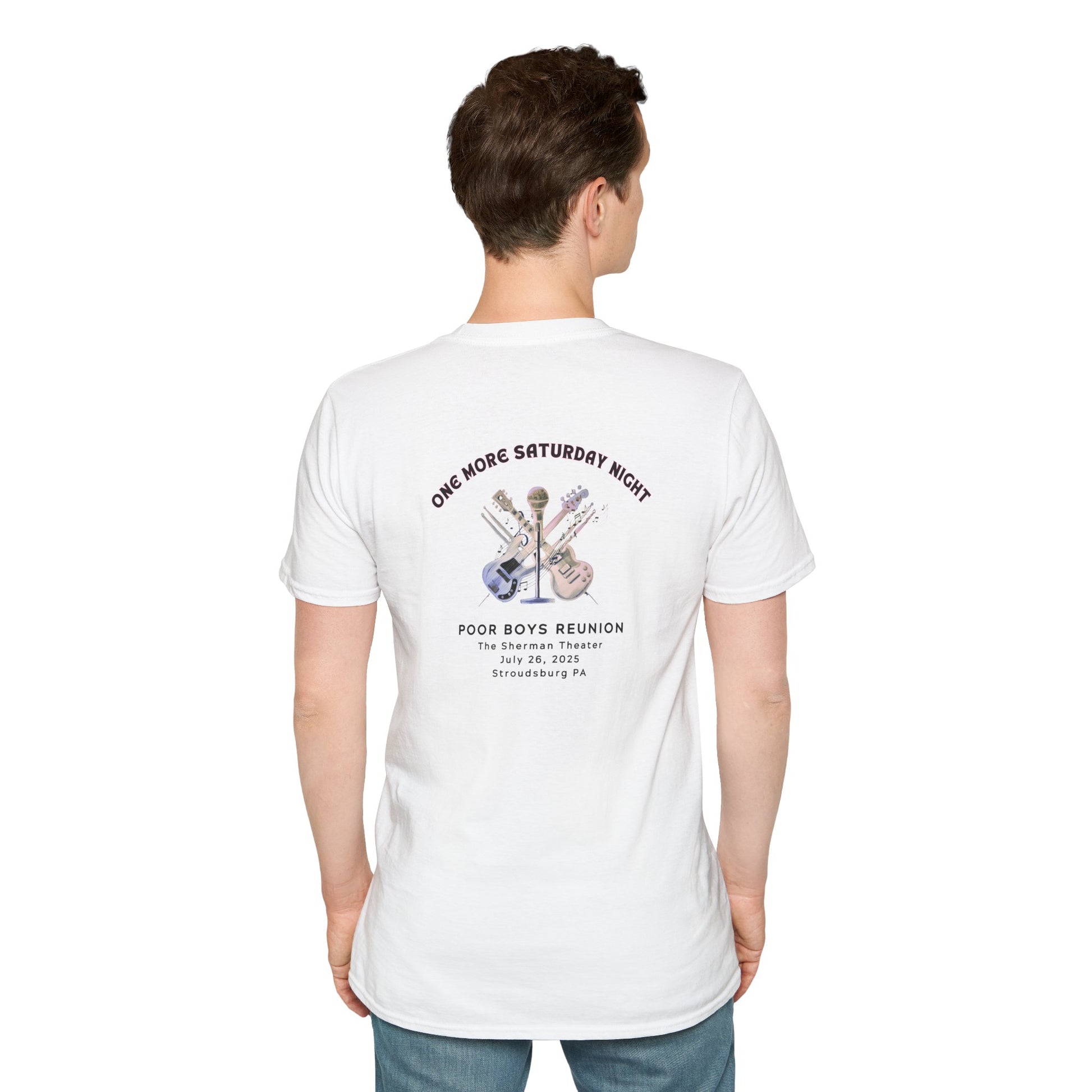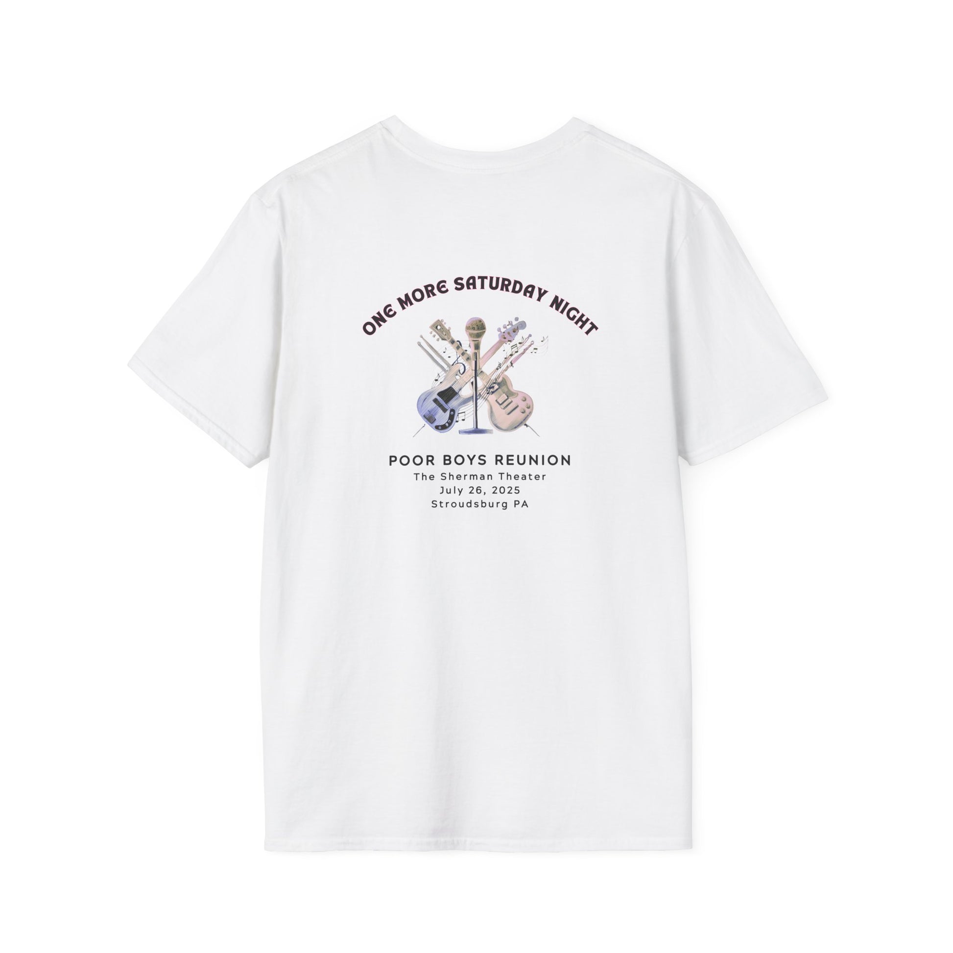 This unisex softstyle tee blends classic comfort with a nod to one unforgettable night. The front features the original Willie & The Poor Boys logo, while the back highlights the official 2025 One More Saturday Night reunion artwork - complete with guitars, drumsticks, and a mic at center stage.