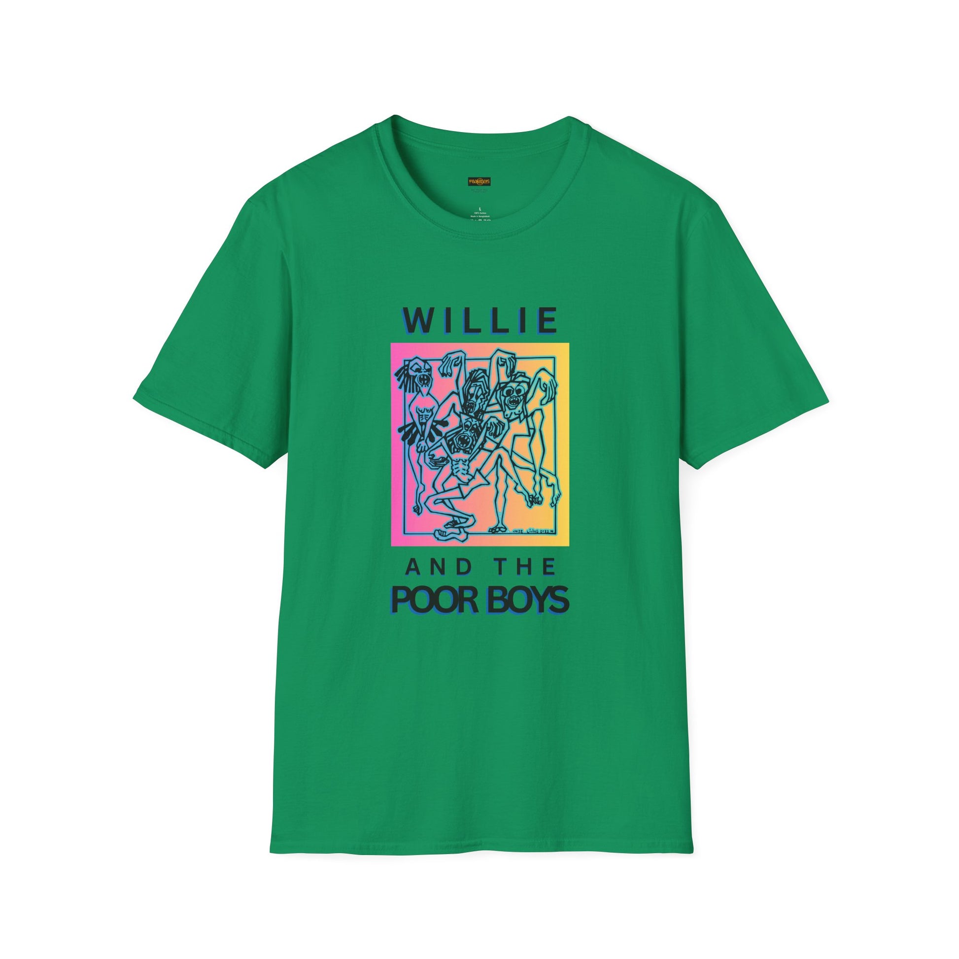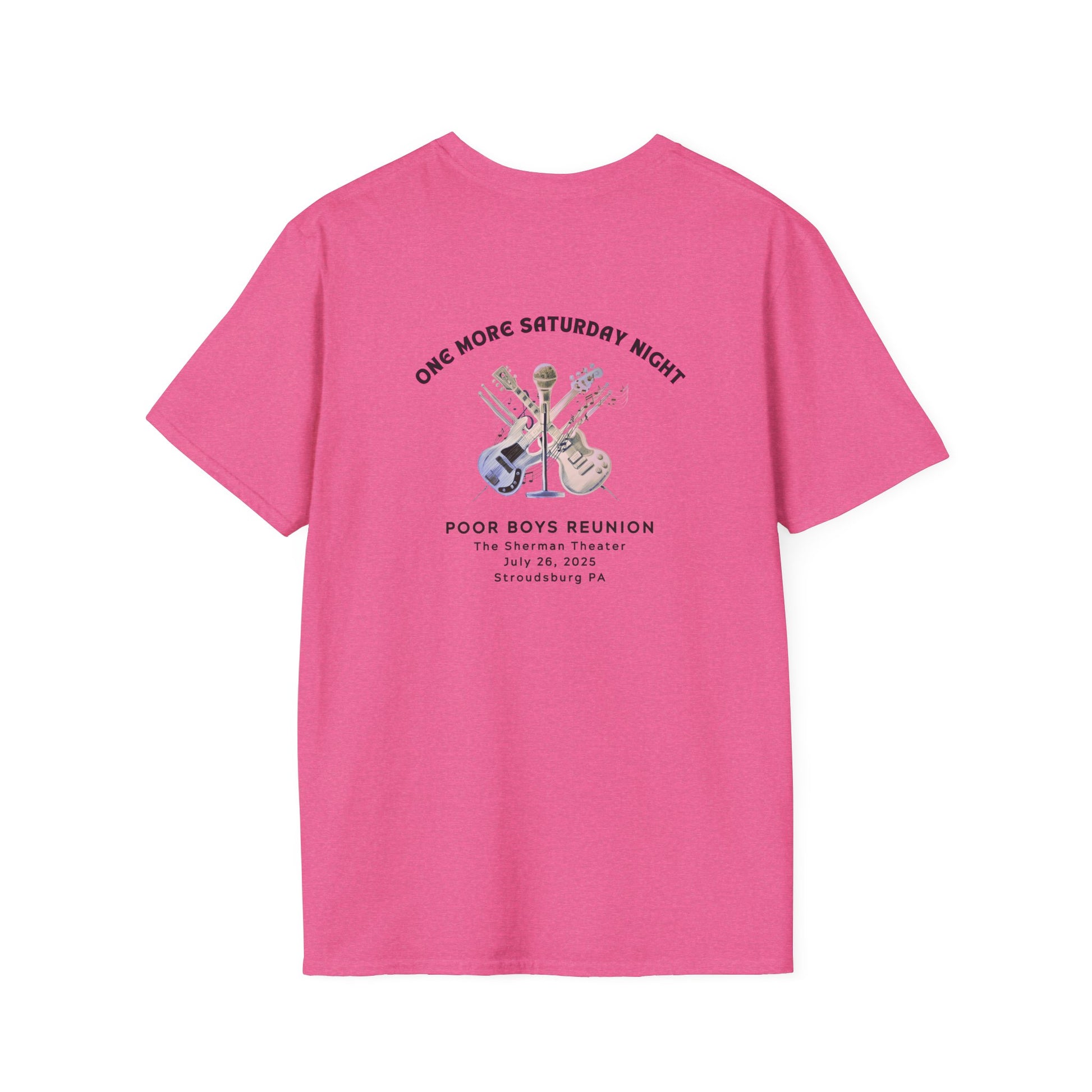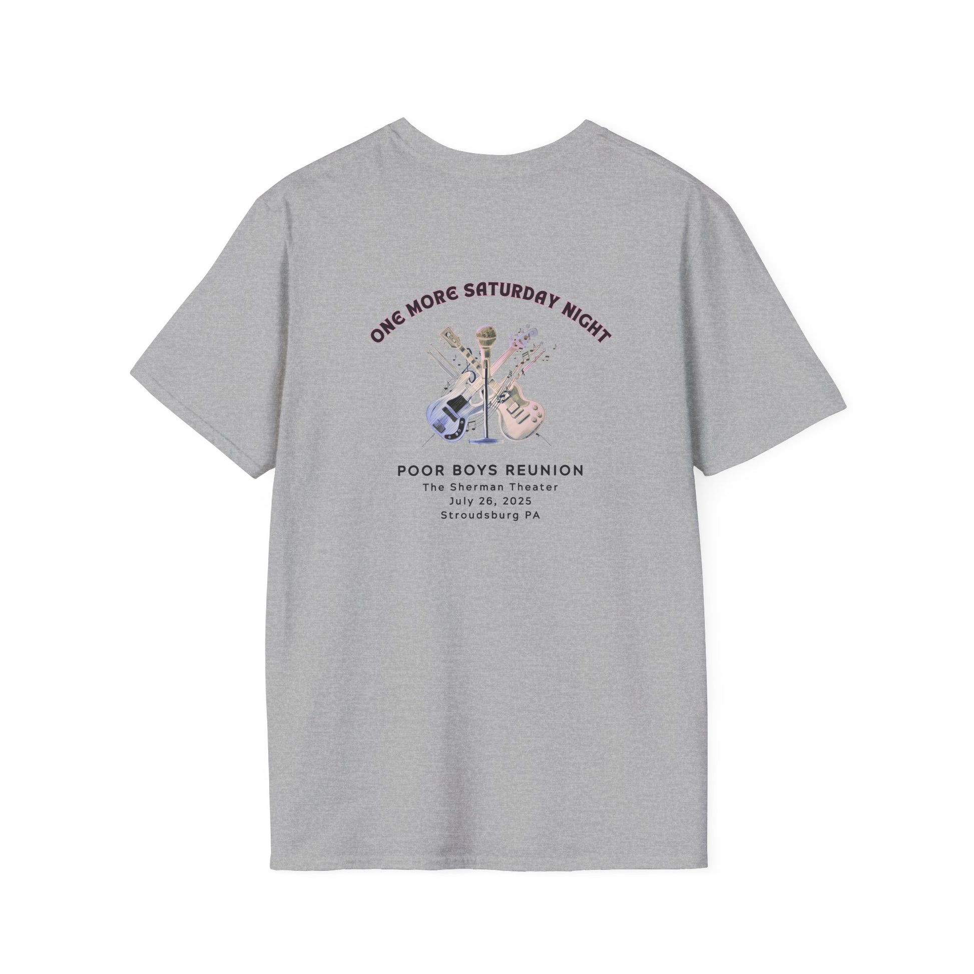This unisex softstyle tee blends classic comfort with a nod to one unforgettable night. The front features the original Willie & The Poor Boys logo, while the back highlights the official 2025 One More Saturday Night reunion artwork - complete with guitars, drumsticks, and a mic at center stage.