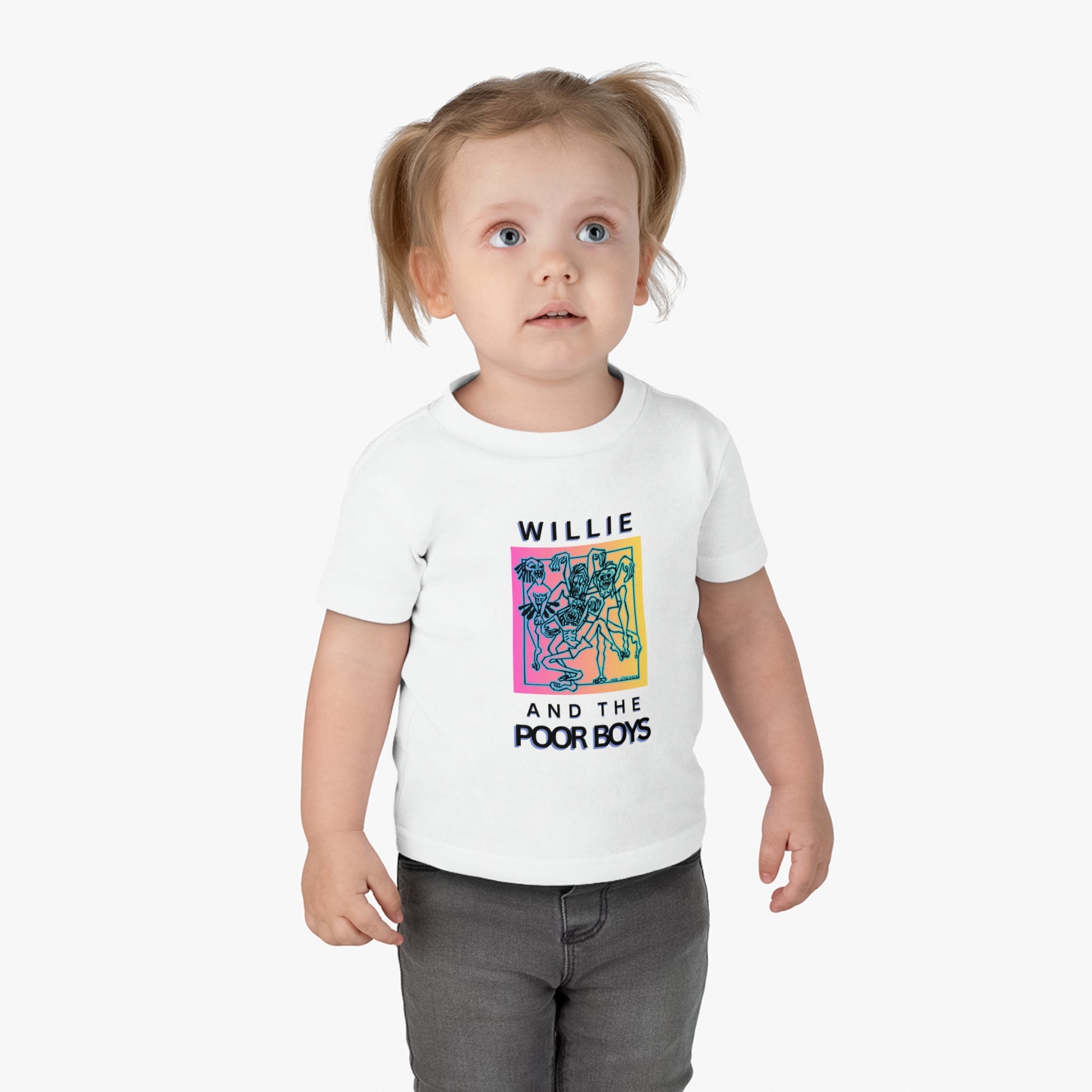 Let your little one carry on the tradition with this soft, 100% cotton infant tee featuring the original Willie & The Poor Boys logo on the front. The back showcases the 2025 reunion artwork with guitars, a mic, and the iconic "One More Saturday Night" theme — now complete with a special Poor Boys Fan Club – Infant Edition badge.