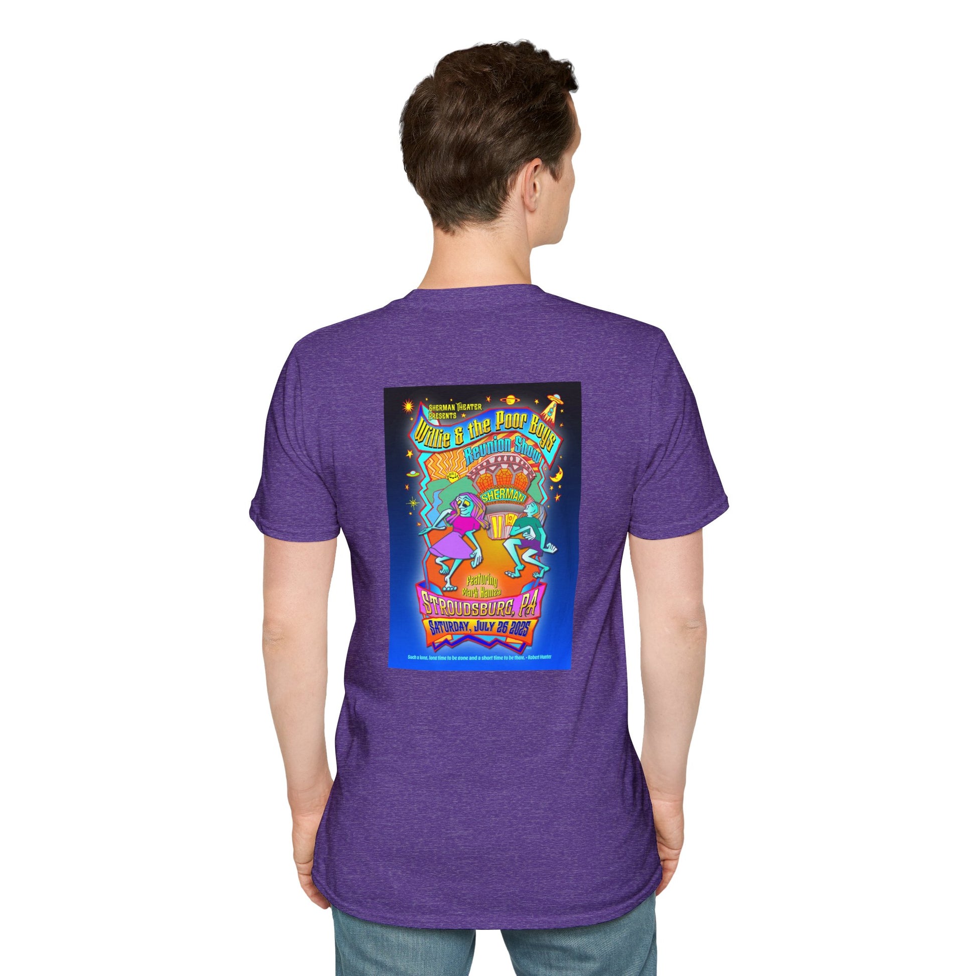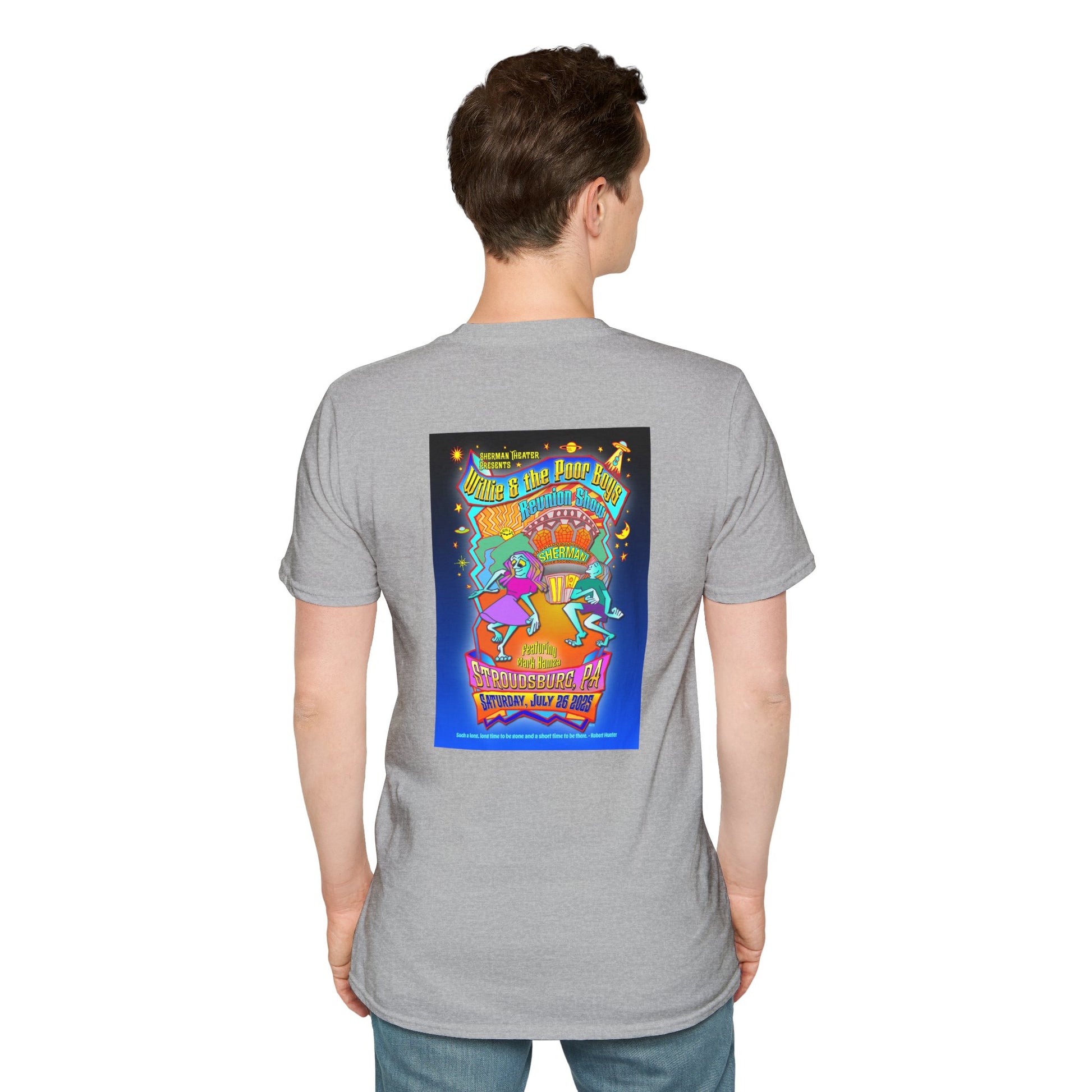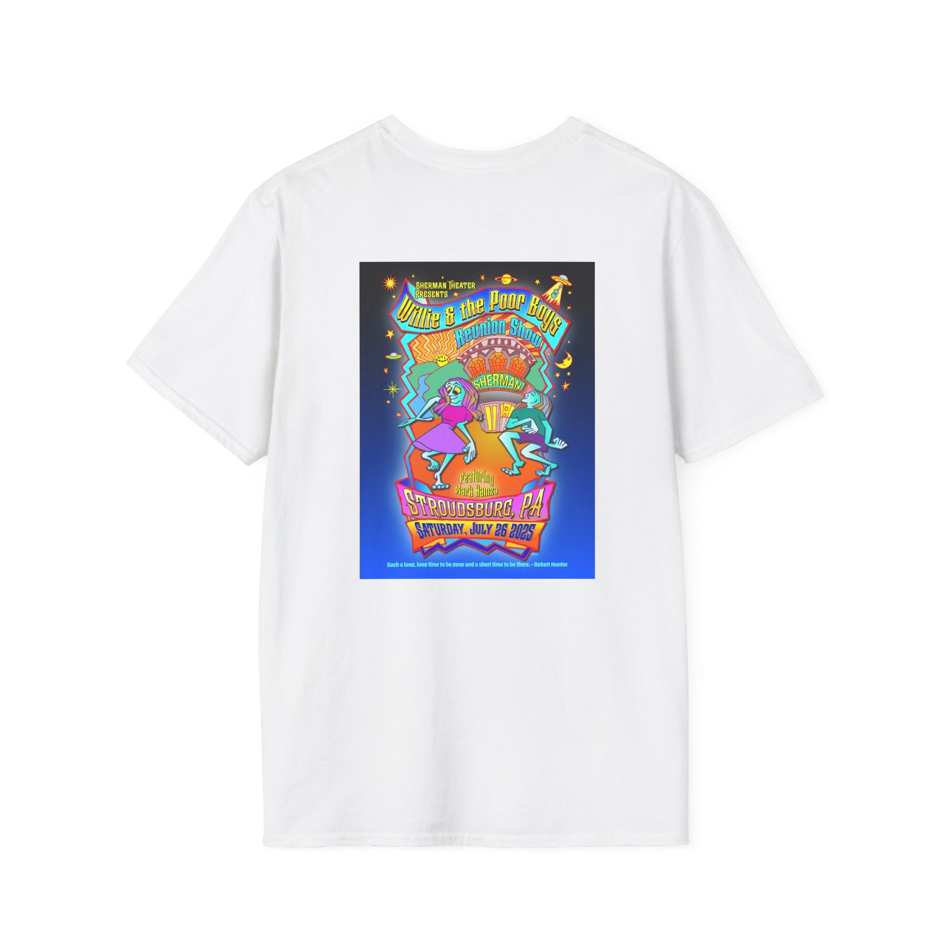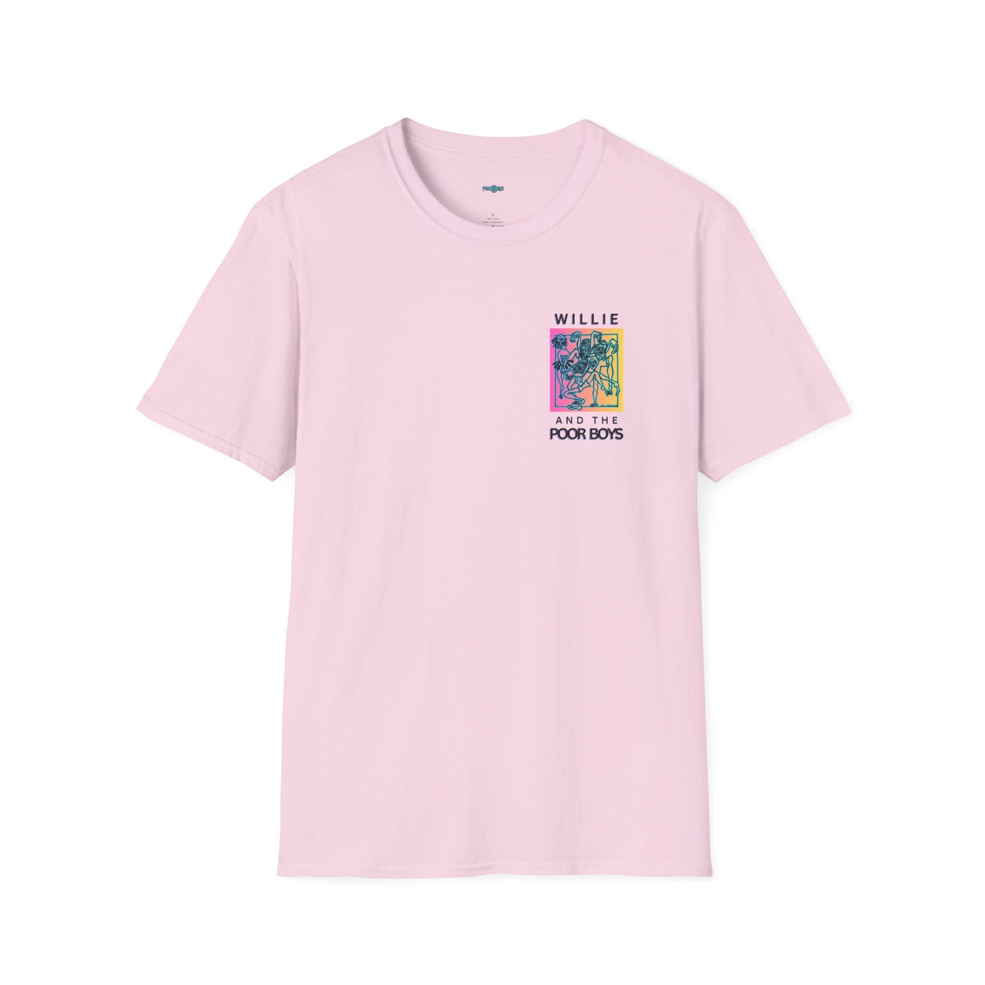 This unisex softstyle tee blends classic comfort with a bold design created exclusively for the 2025 reunion. The front features the original Willie & The Poor Boys logo by Gary Knize, while the back showcases his new, hand-drawn reunion poster design—celebrating the band’s return to the stage in Stroudsburg, PA.