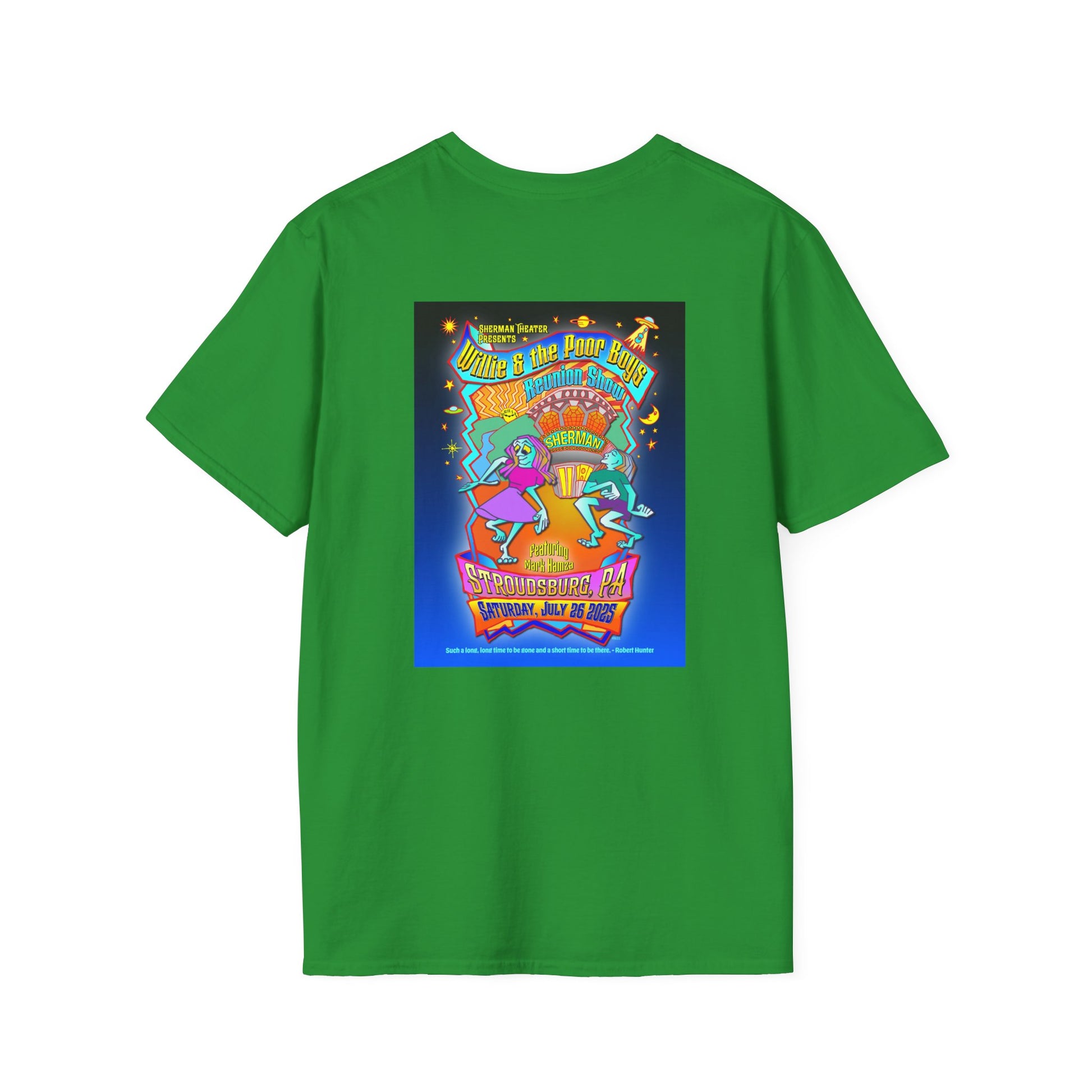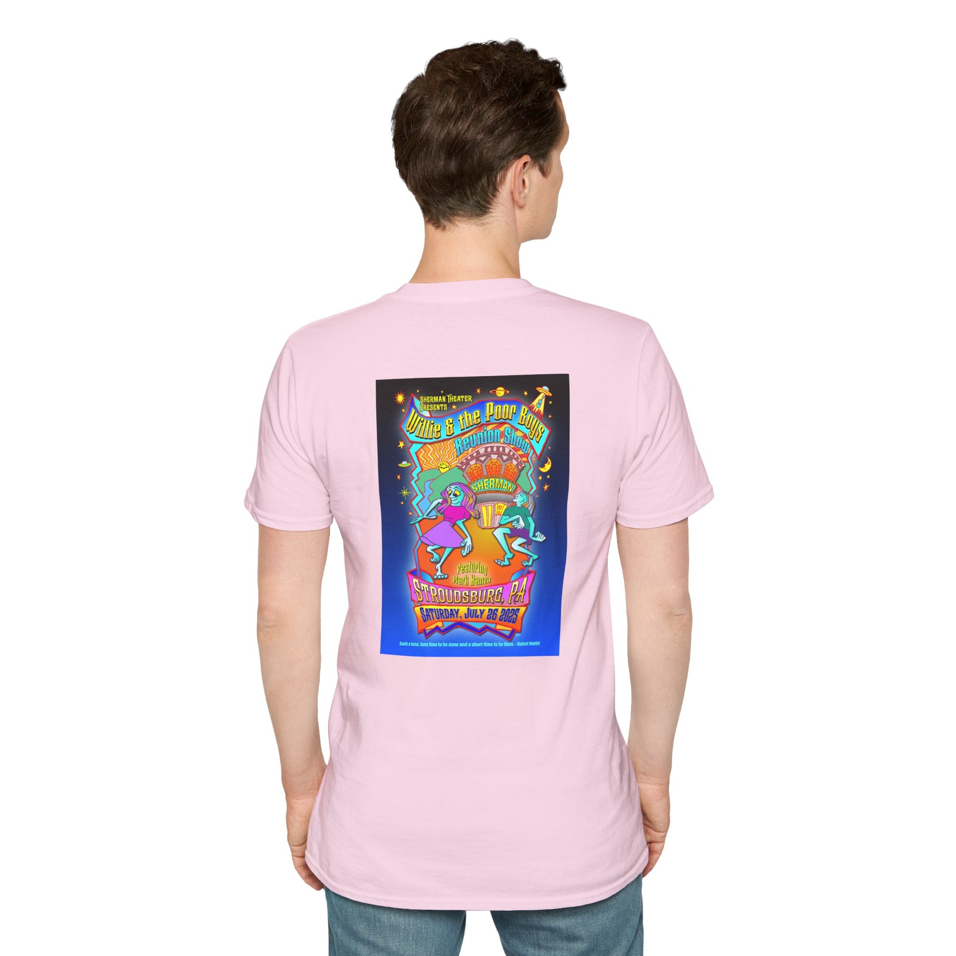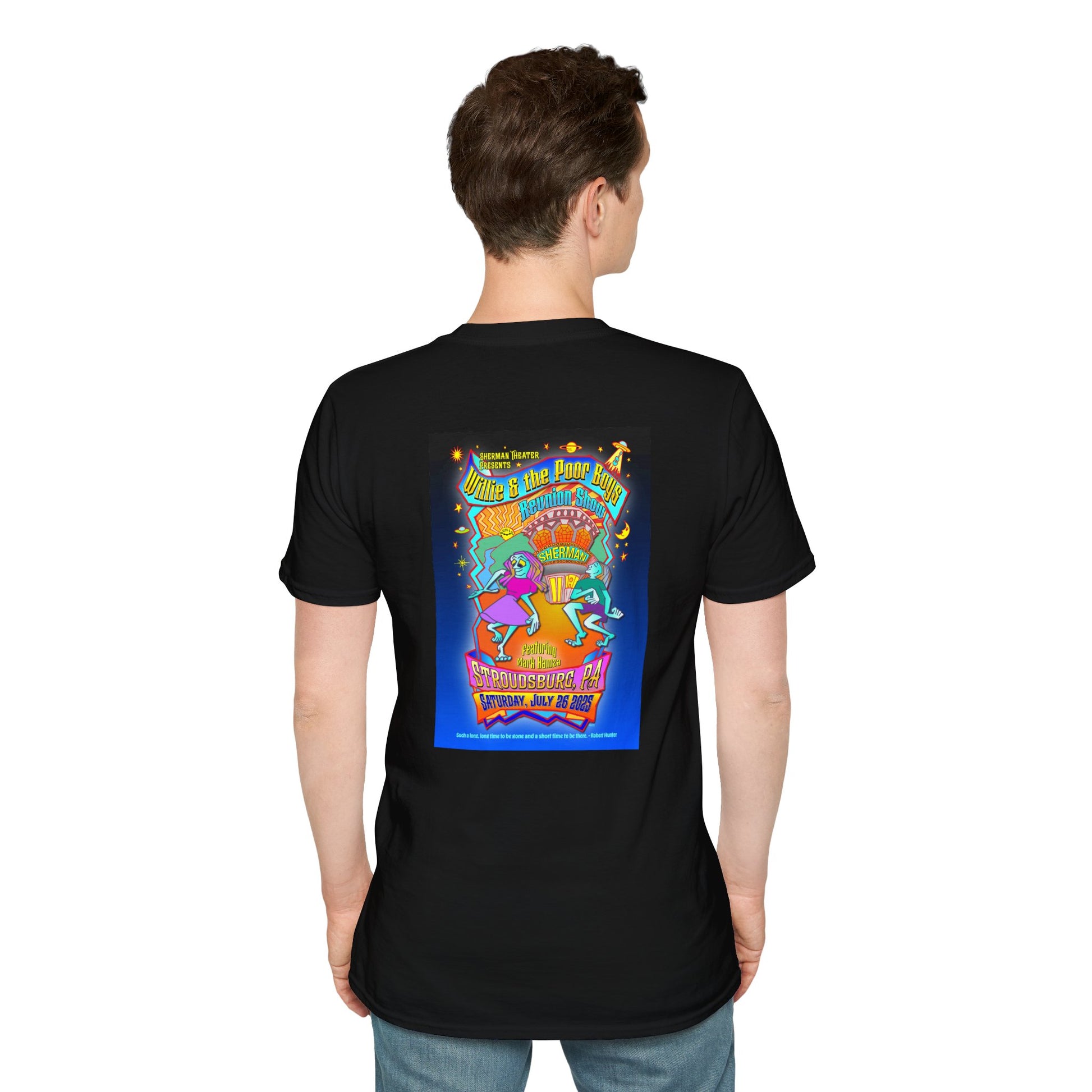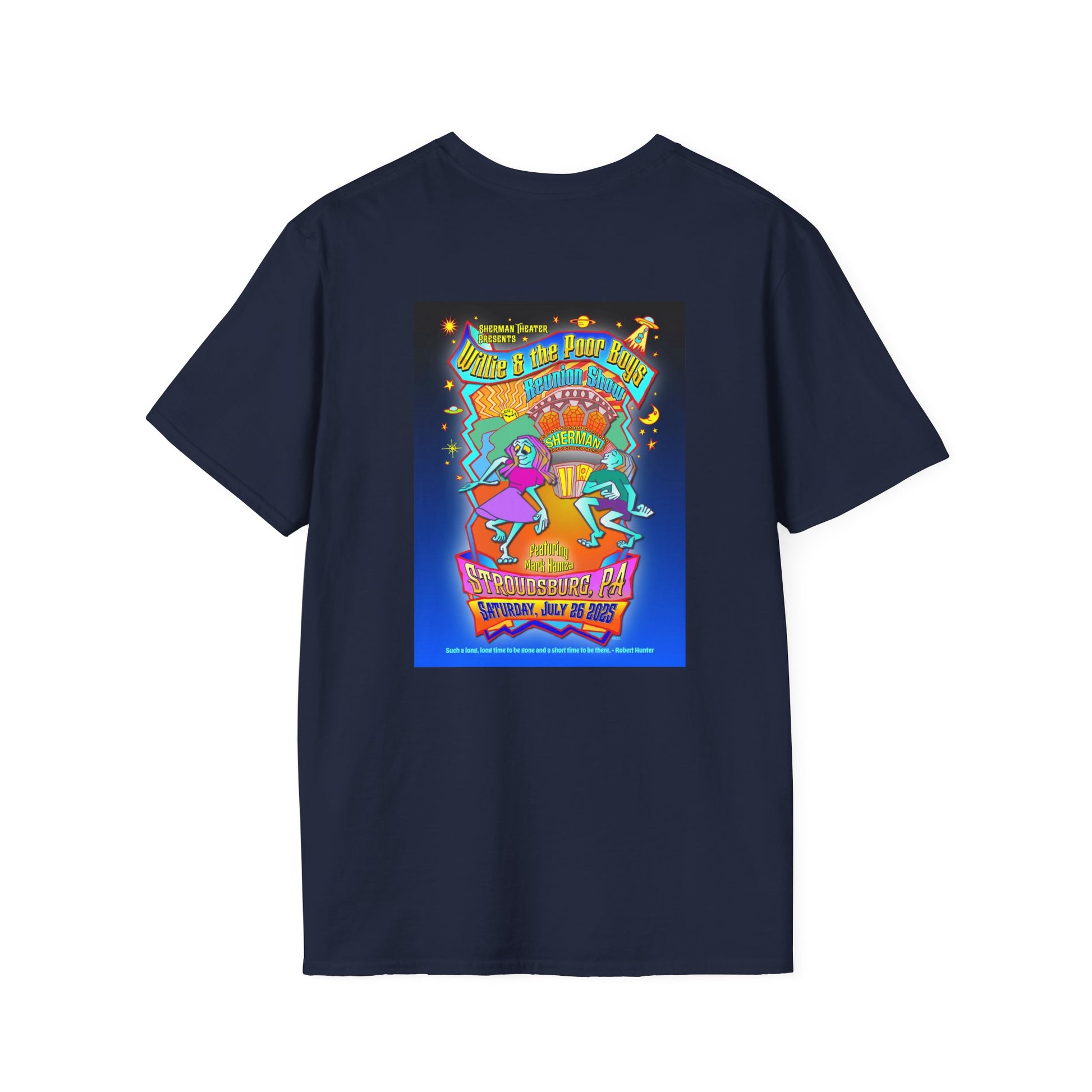 This unisex softstyle tee blends classic comfort with a bold design created exclusively for the 2025 reunion. The front features the original Willie & The Poor Boys logo by Gary Knize, while the back showcases his new, hand-drawn reunion poster design—celebrating the band’s return to the stage in Stroudsburg, PA.