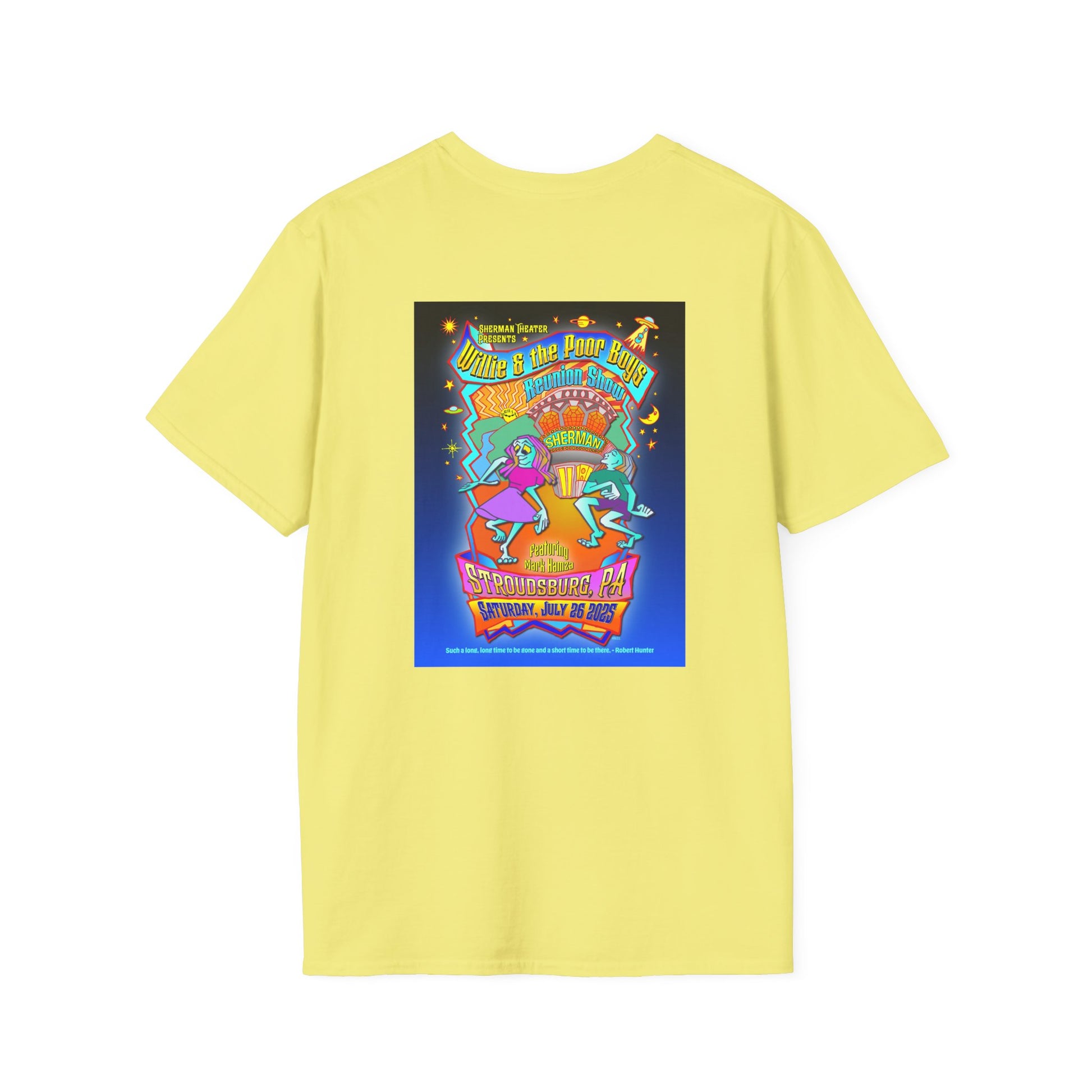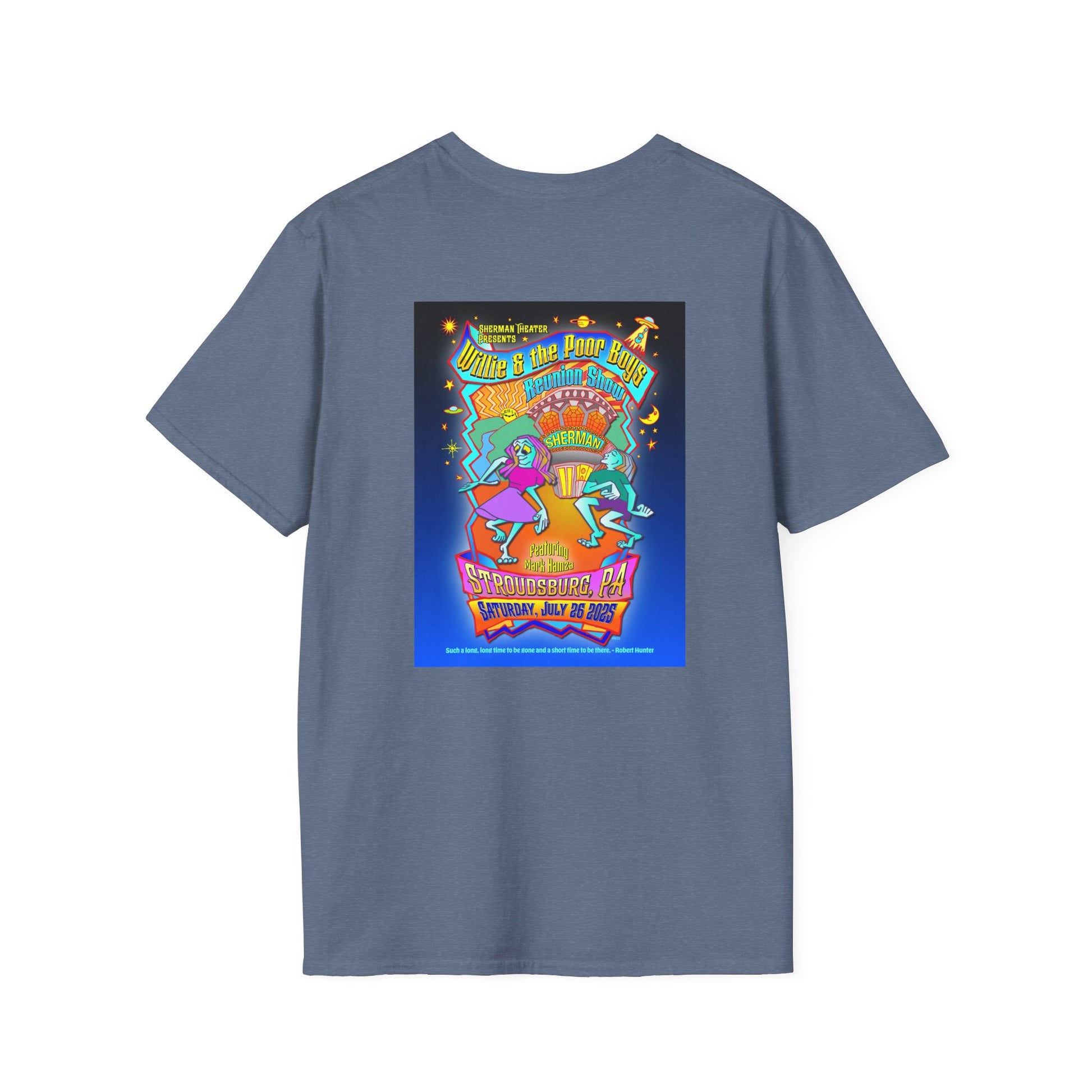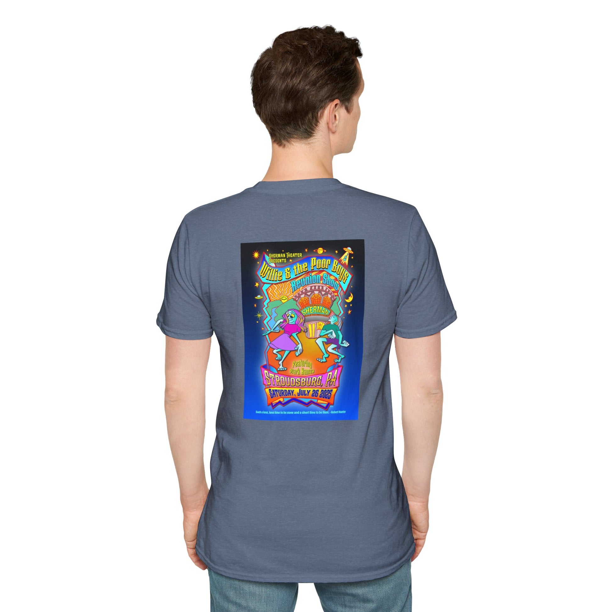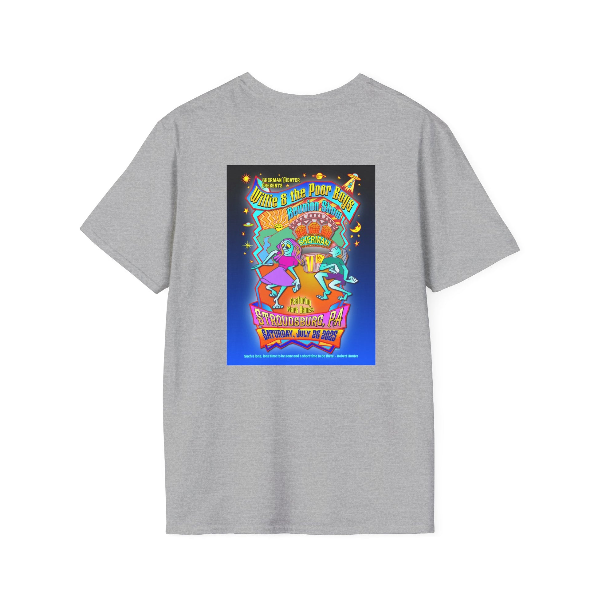 This unisex softstyle tee blends classic comfort with a bold design created exclusively for the 2025 reunion. The front features a pocket size Poor Boys logo, while the back showcases Gary Knize's new, hand-drawn reunion poster design - celebrating the band’s return to the stage in Stroudsburg, PA.
